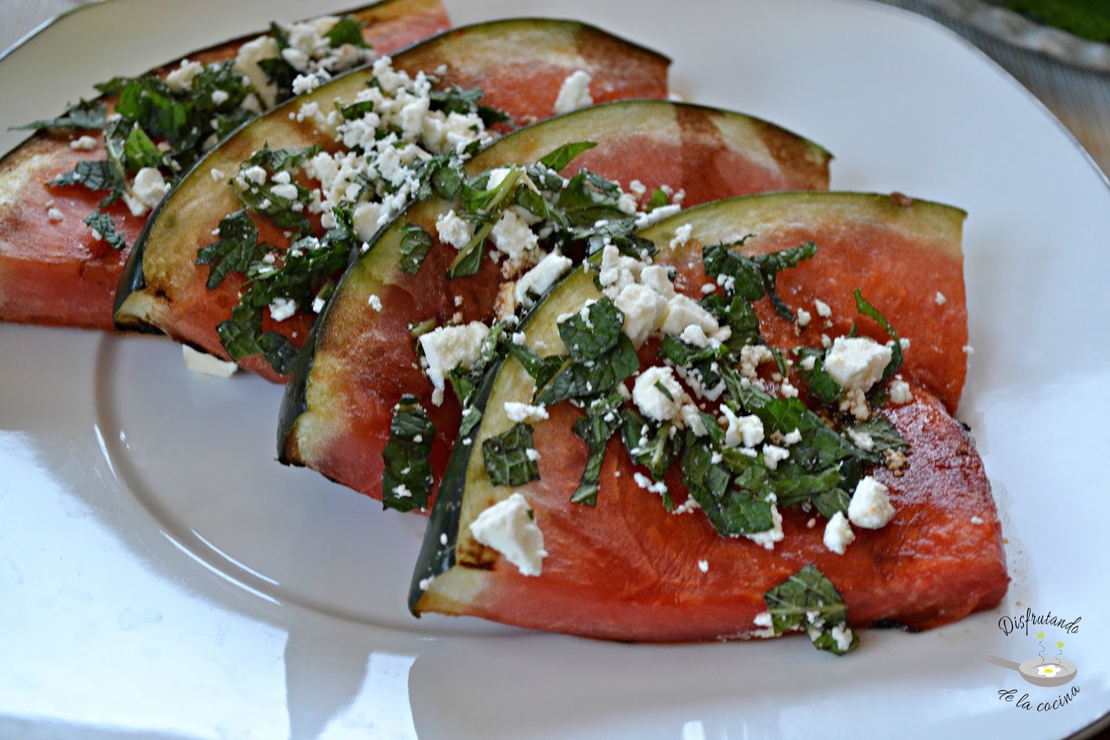 - Sandía braseada con queso feta y hierbabuena